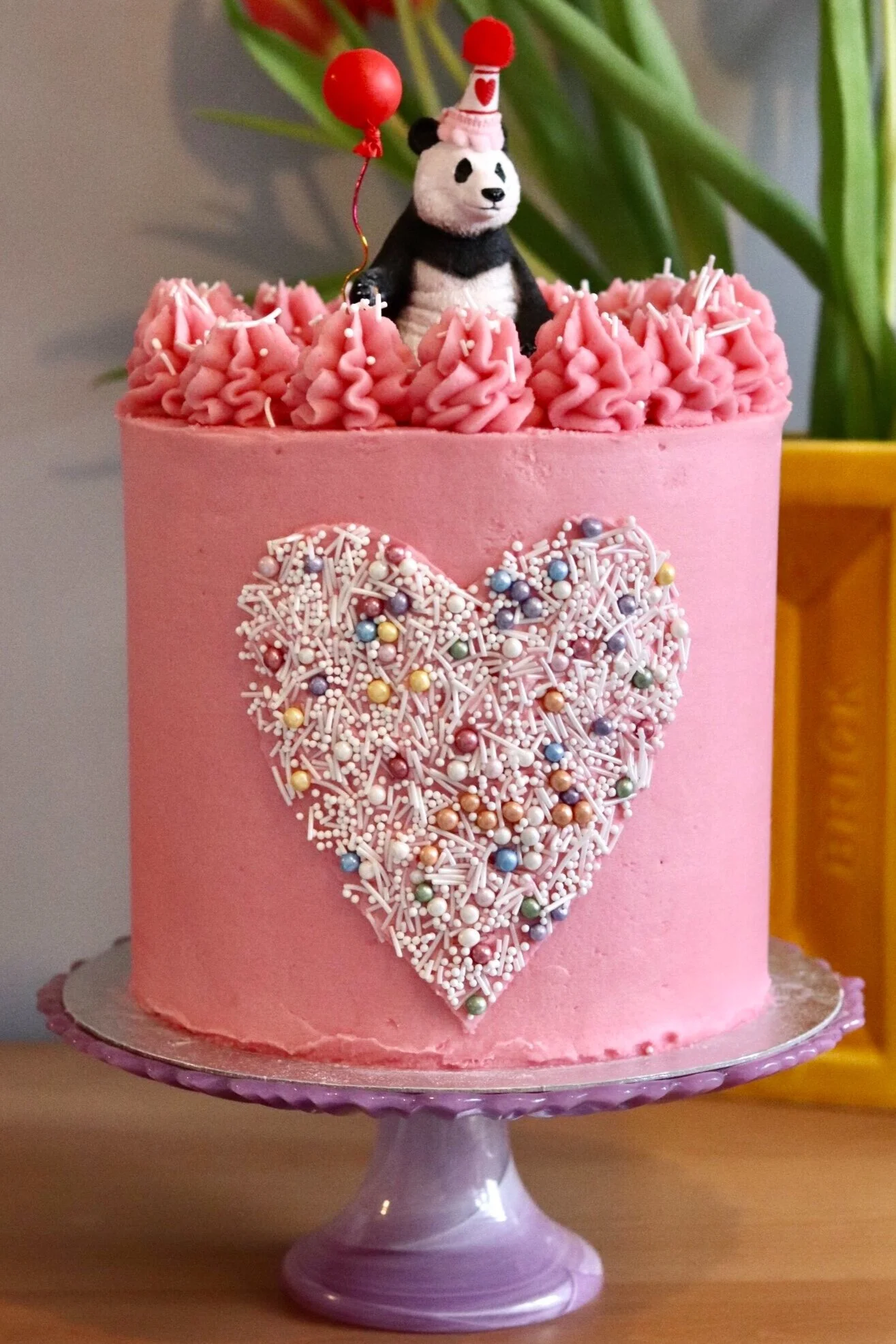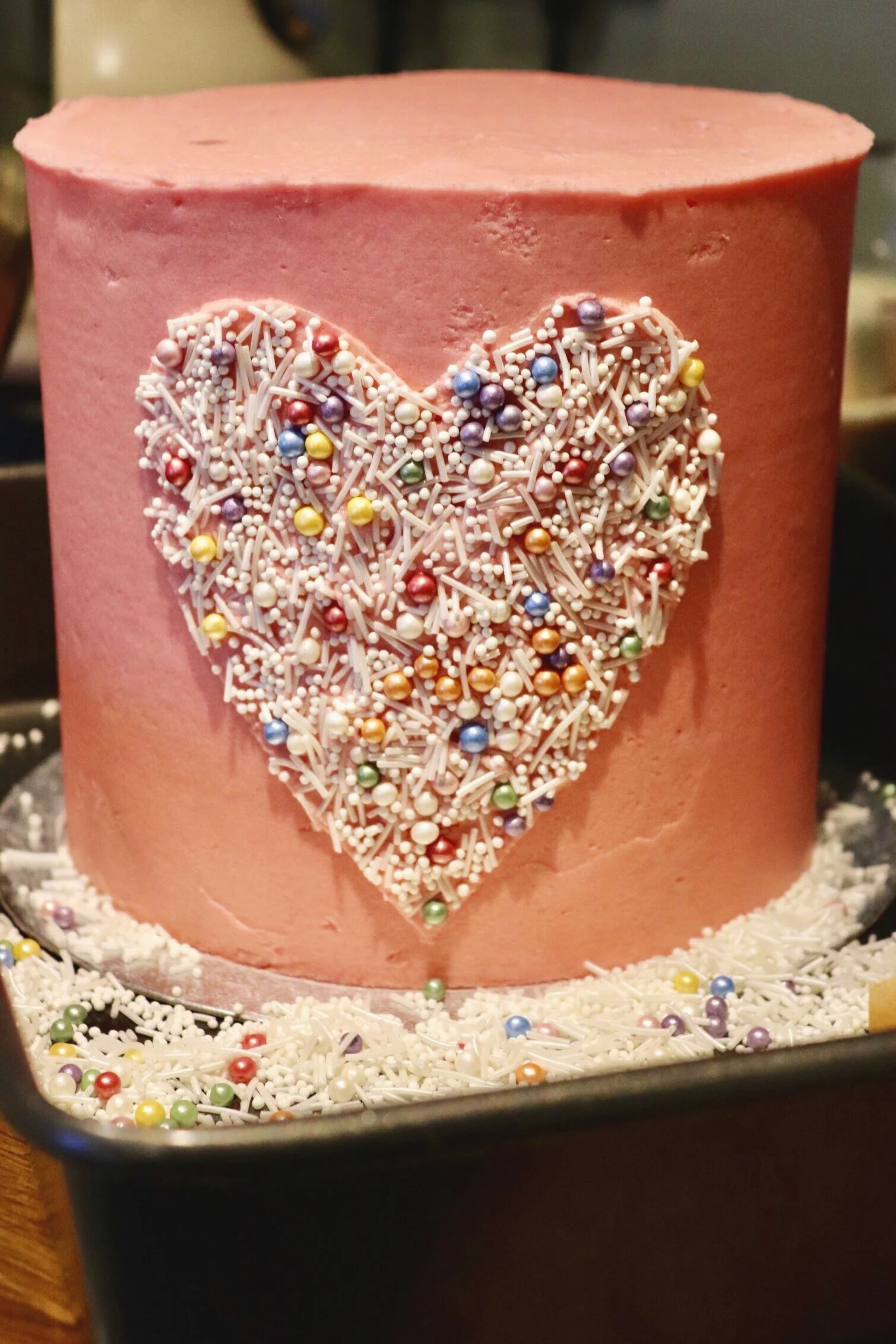 Now, tip a handful of sprinkles into the palm of your hand and press your hand into the heart shape on the cake. Press firmly to ensure the sprinkles are nestled nicely in the buttercream. Repeat until you have a full heart. You can fill in the gaps with tweezers if necessary.