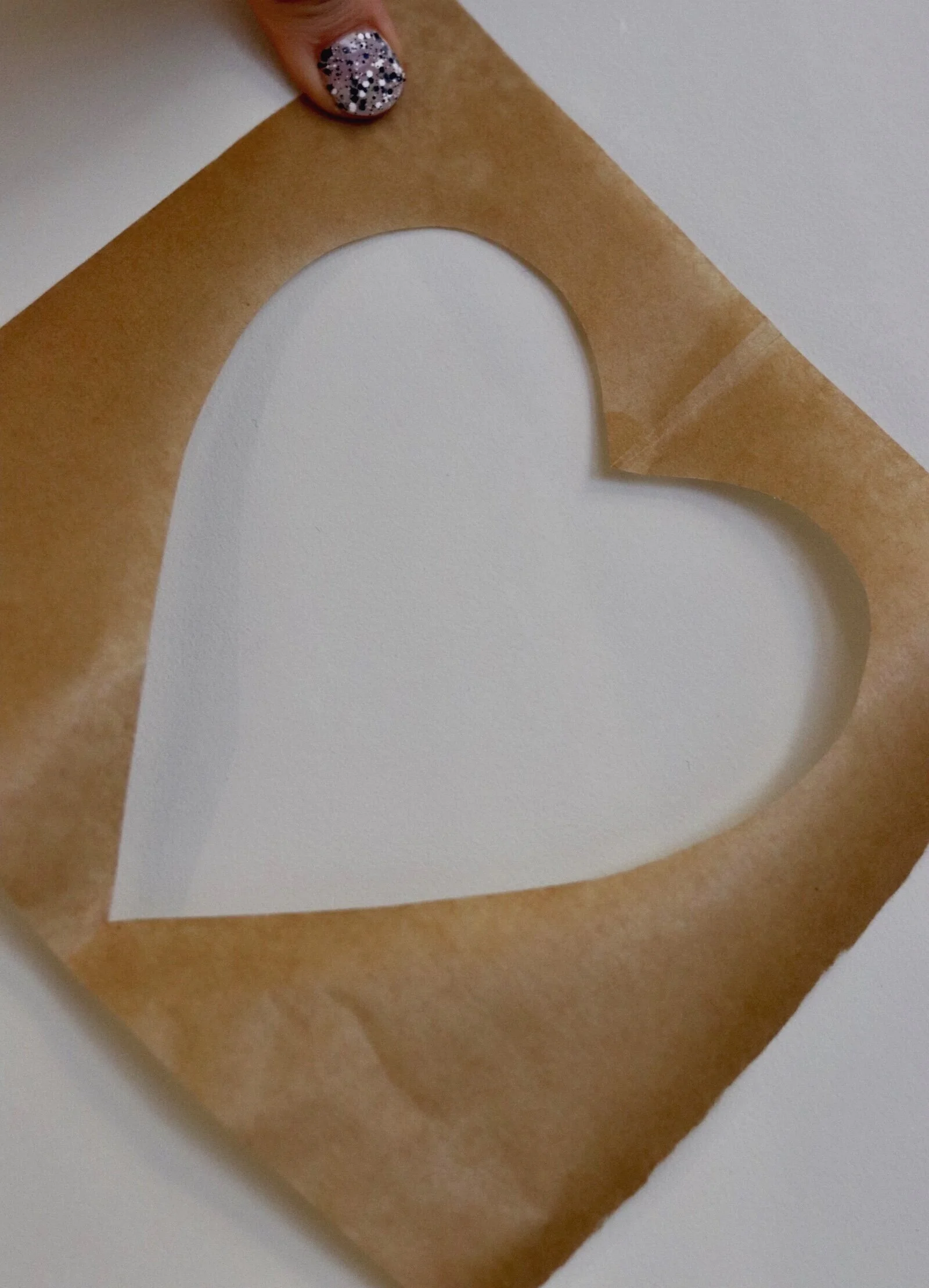 Take a square of greaseproof paper, which fits nicely on the front of your cake, fold it in half, and cut out the shape of half a heart. Open out and voila…a perfectly symmetrical heart.
